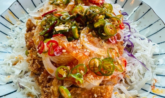영양군의 특산물인 영양고추를 이용해서 만든 새콤매콤한 영양고추소스와 아삭한양배추위에 바삭한 돈까스를 올린 달식당 시그니쳐 메뉴